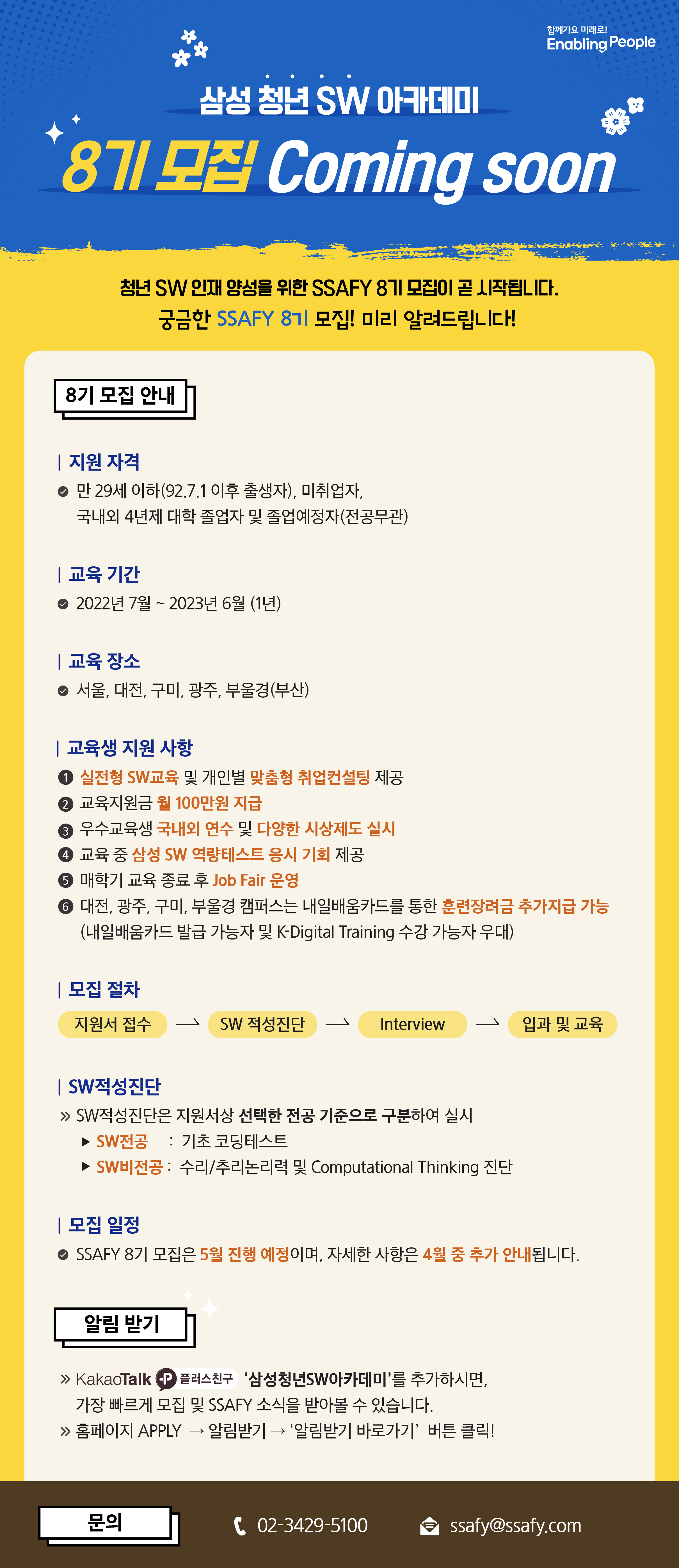 12개월간 전국 5개 지역 캠퍼스에서 교육받을 수 있으며, 커리큘럼은 파이썬, 자바, 임베디드, 모바일로 나뉜다.